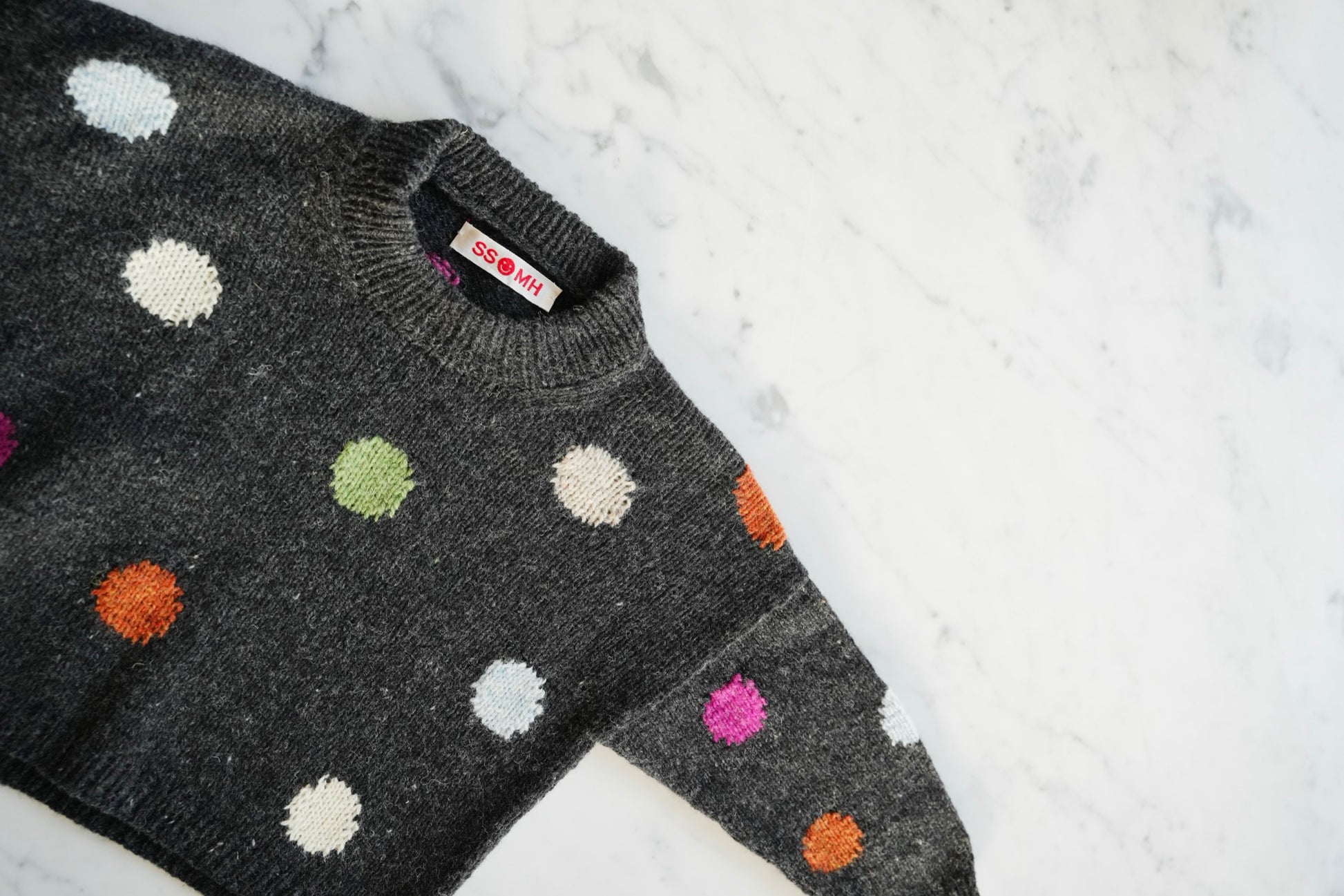 Fri Sweater Kid is worked top down in stockinette stitch with intarsia dots. The construction is simple, and the intarsia section is clear and beginner-friendly, as only one dot is worked at a time. The pattern includes full-size charts.