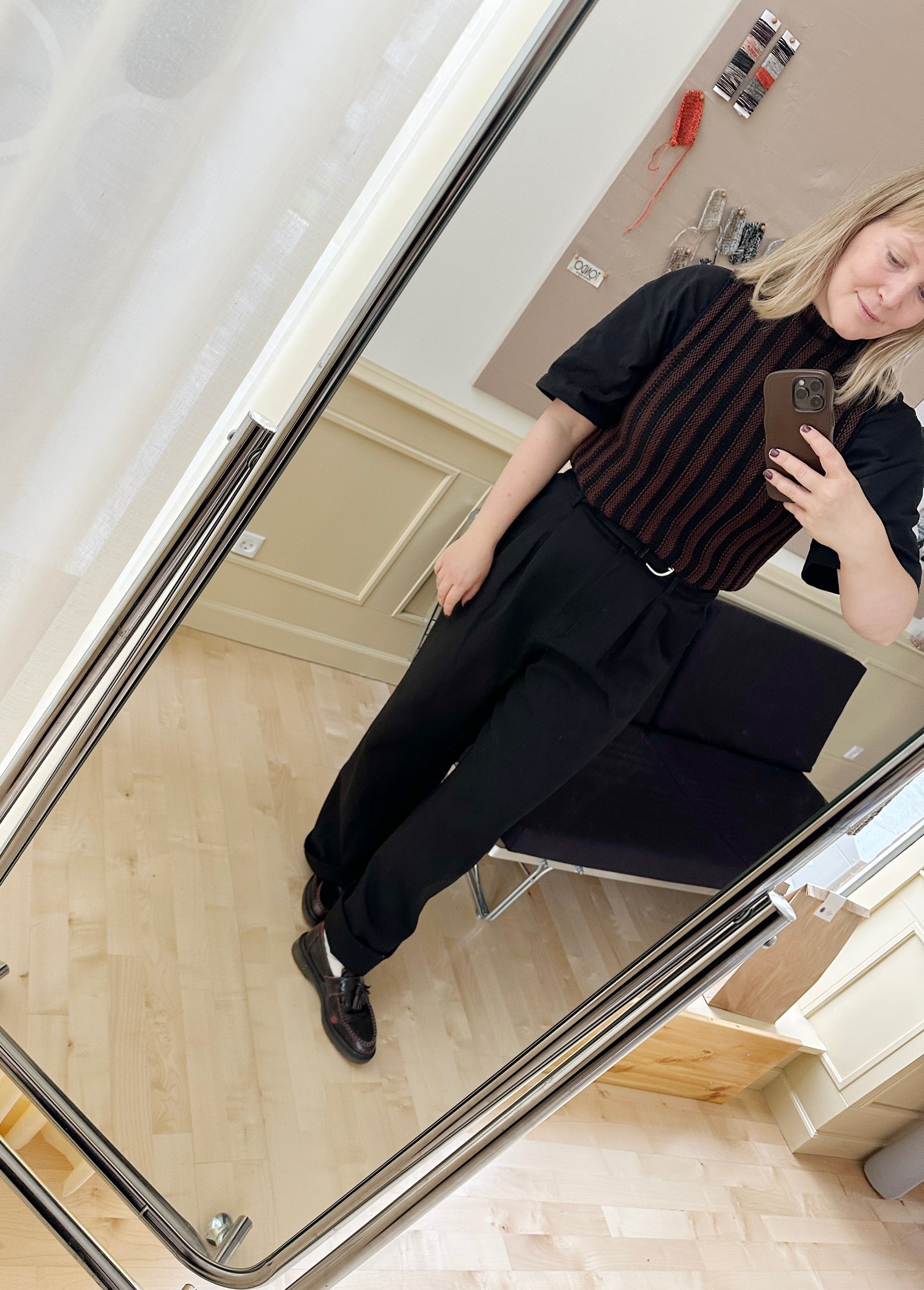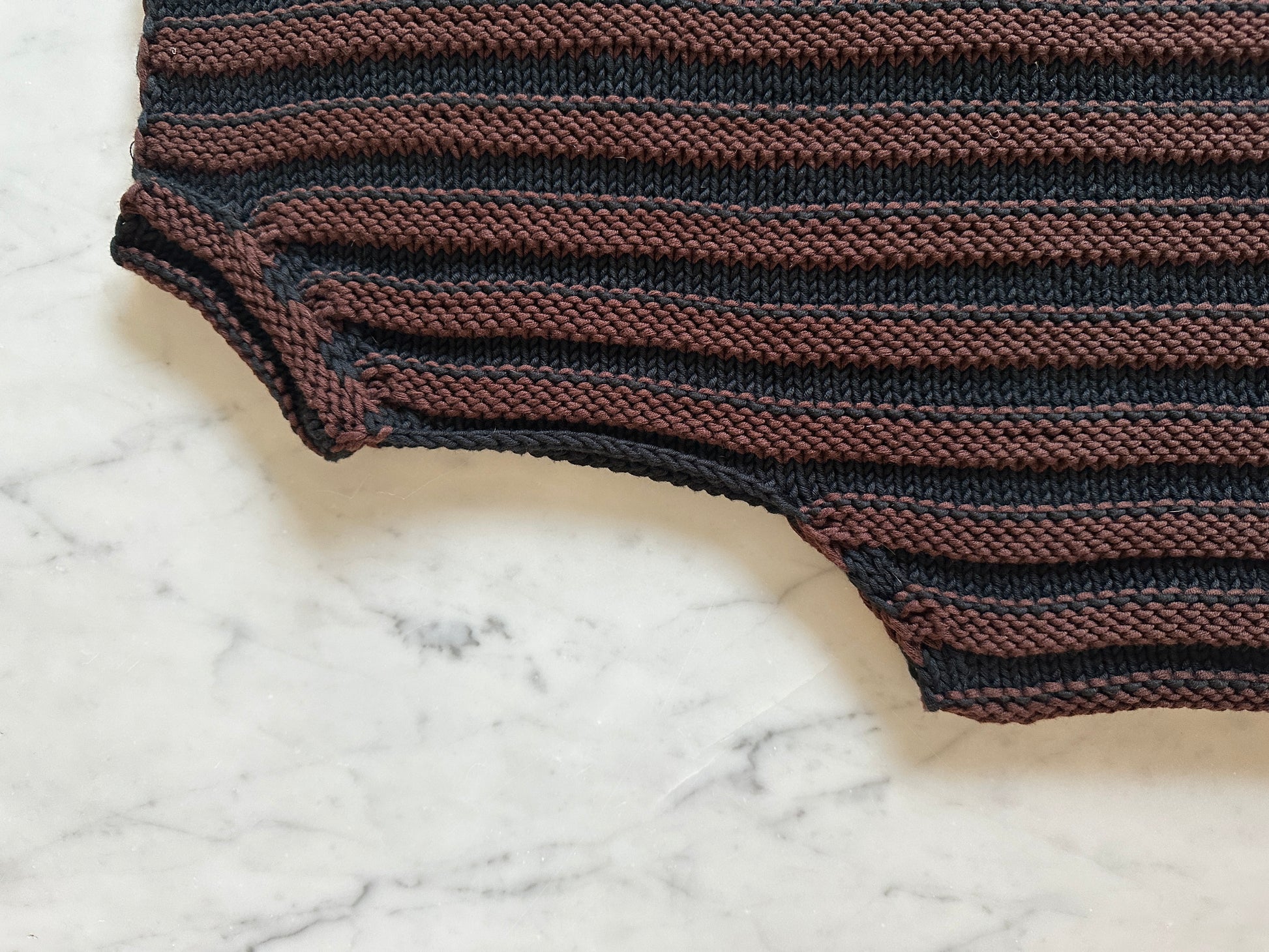 The Axis Slipover is worked sideways in stripes of knit and purl stitches. Afterwards, the shoulders are knitted and then sewn in place using mattress stitch.
