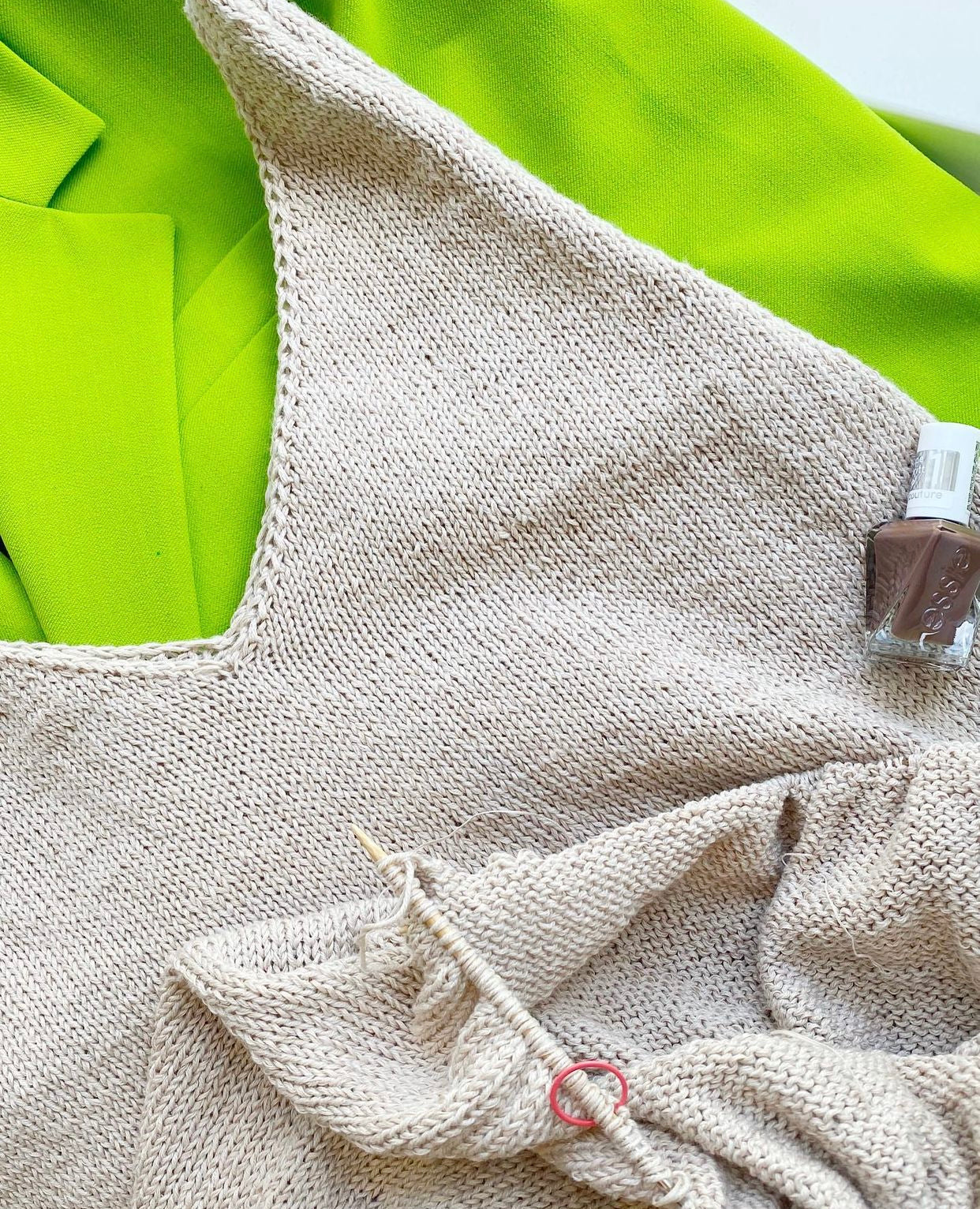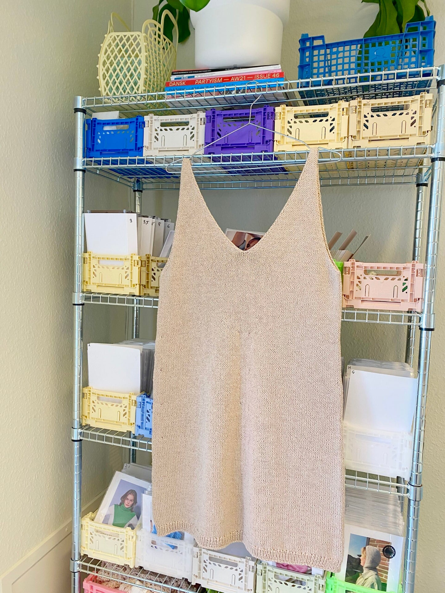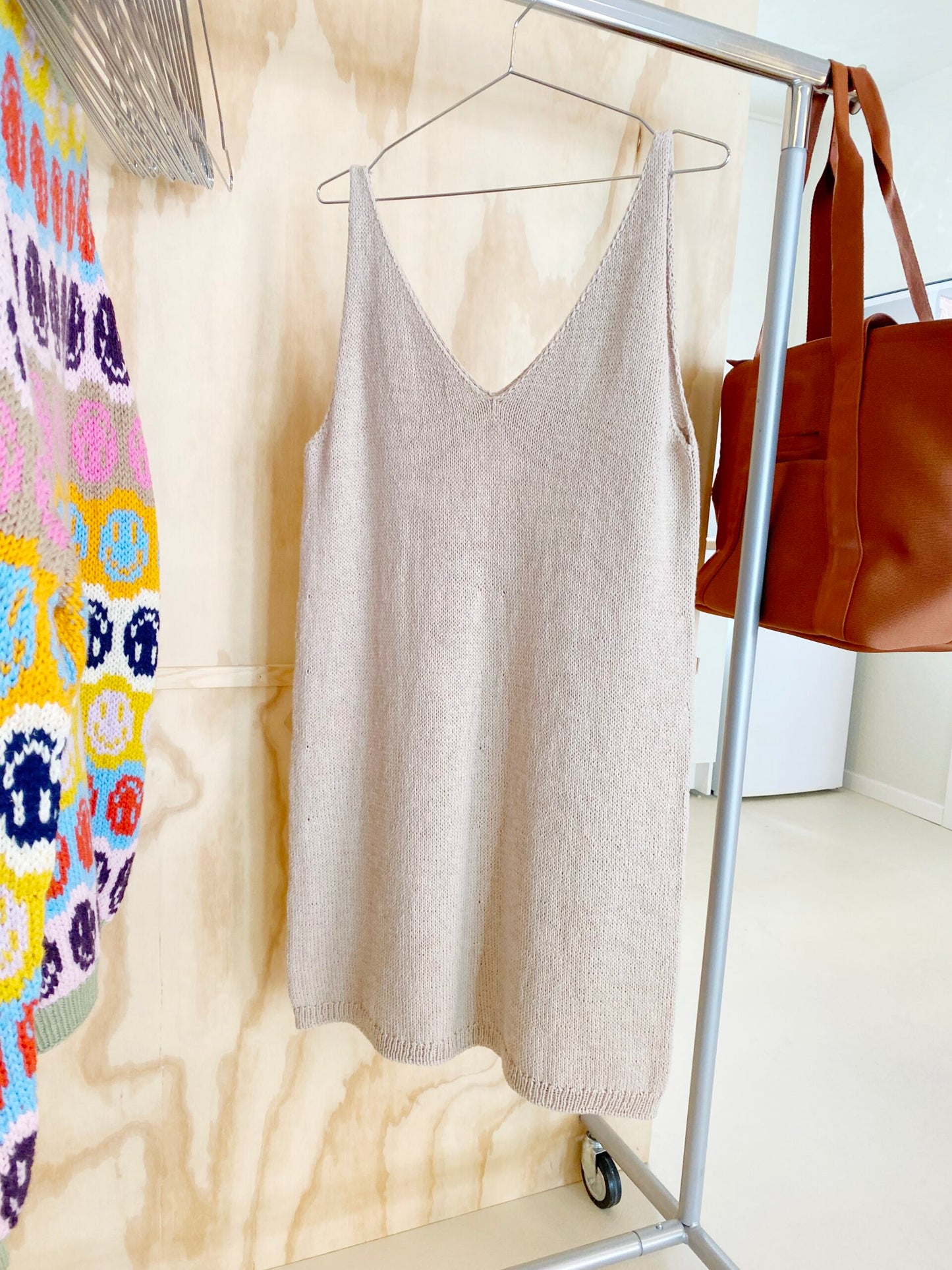 Inge Dress is worked top-down. The dress has a deep V-neck both front and back, and the skirt is slightly A-shaped