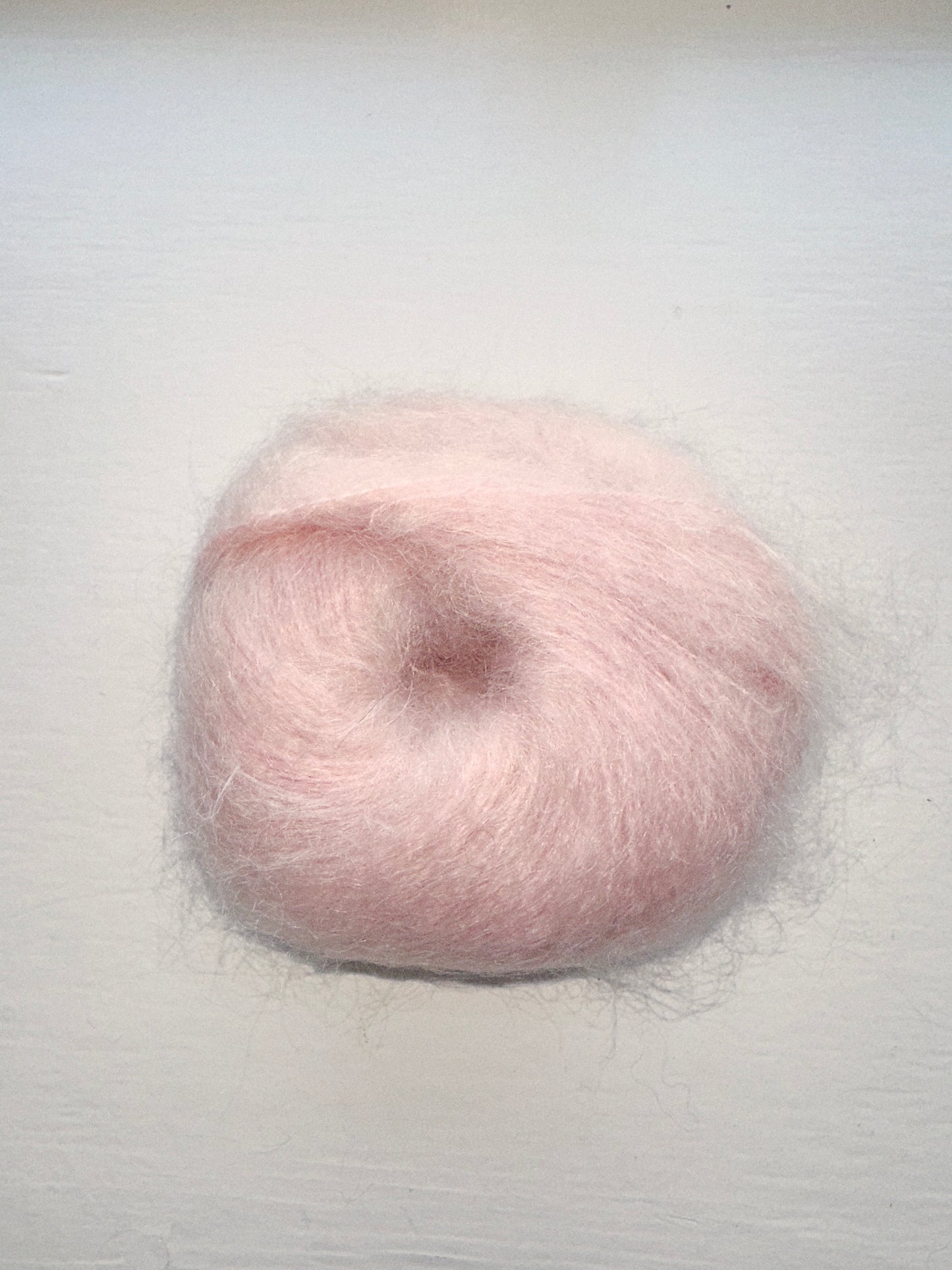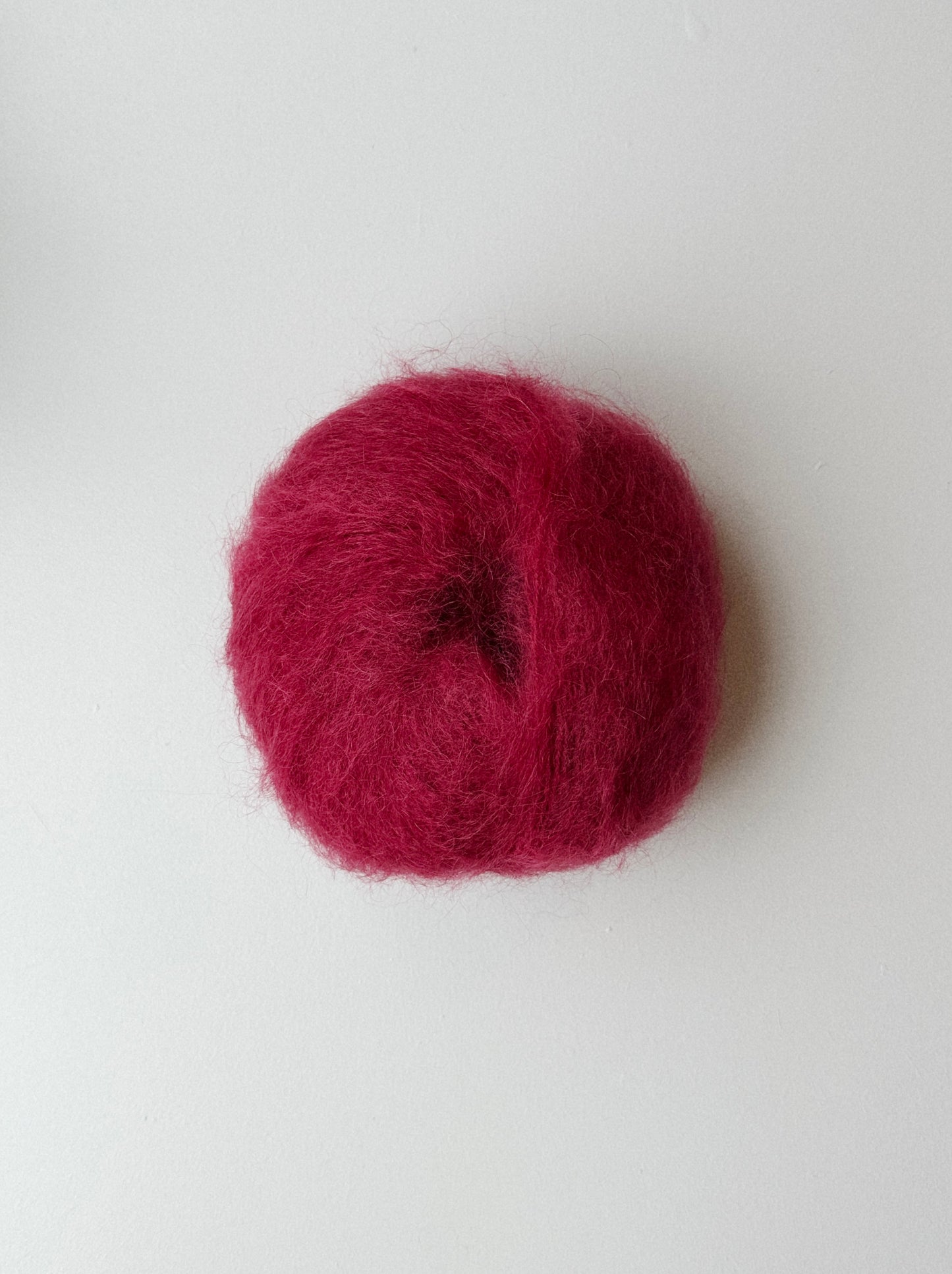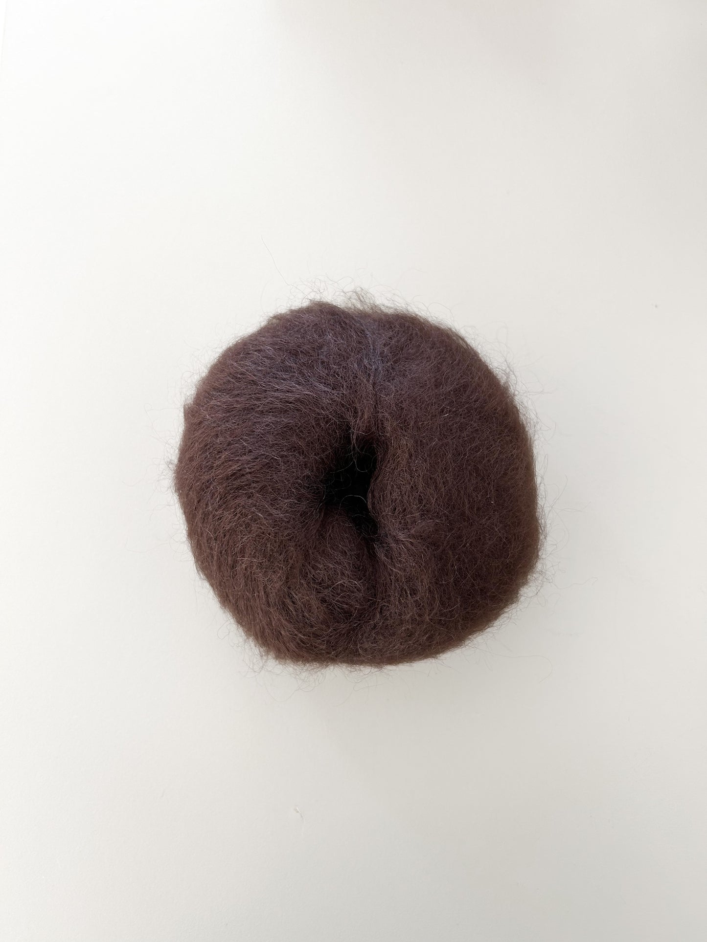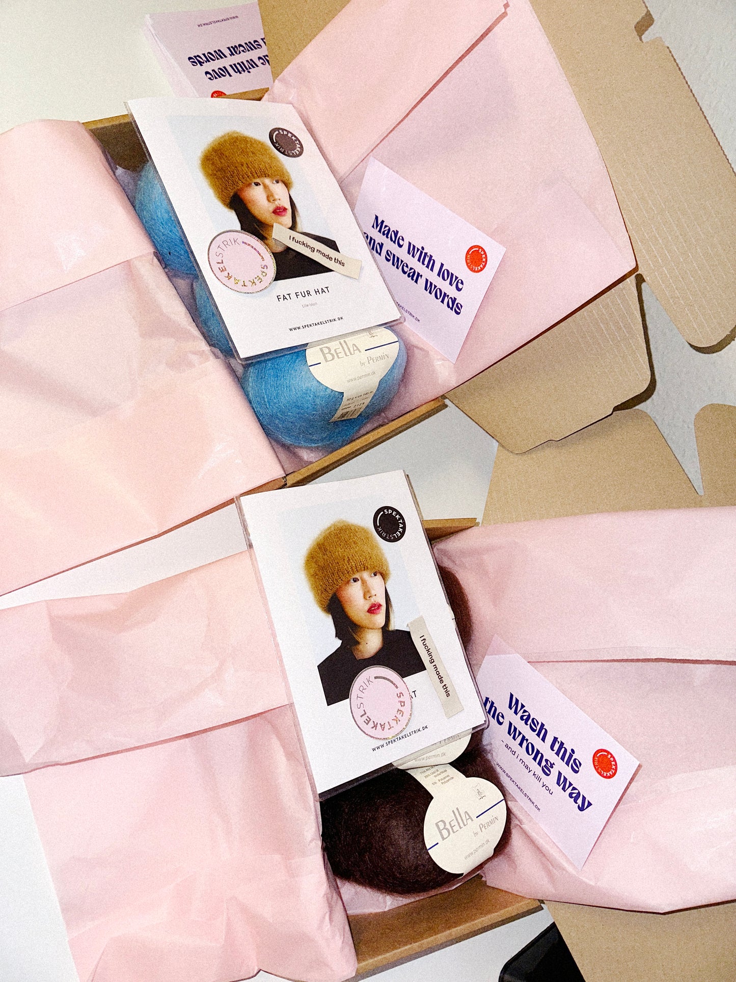 Fat Fur Hat is knitted as a long closed tube with decreases at both ends. The hat is folded into itself and folded at the bottom. The hat is knitted in a long-haired mohair yarn that as a last touch is brushed with a mohair brush so that the fibres become long and fur-like. To get the furry look it is recommended to use a long-fibred yarn like mohair, alpaca or angora.