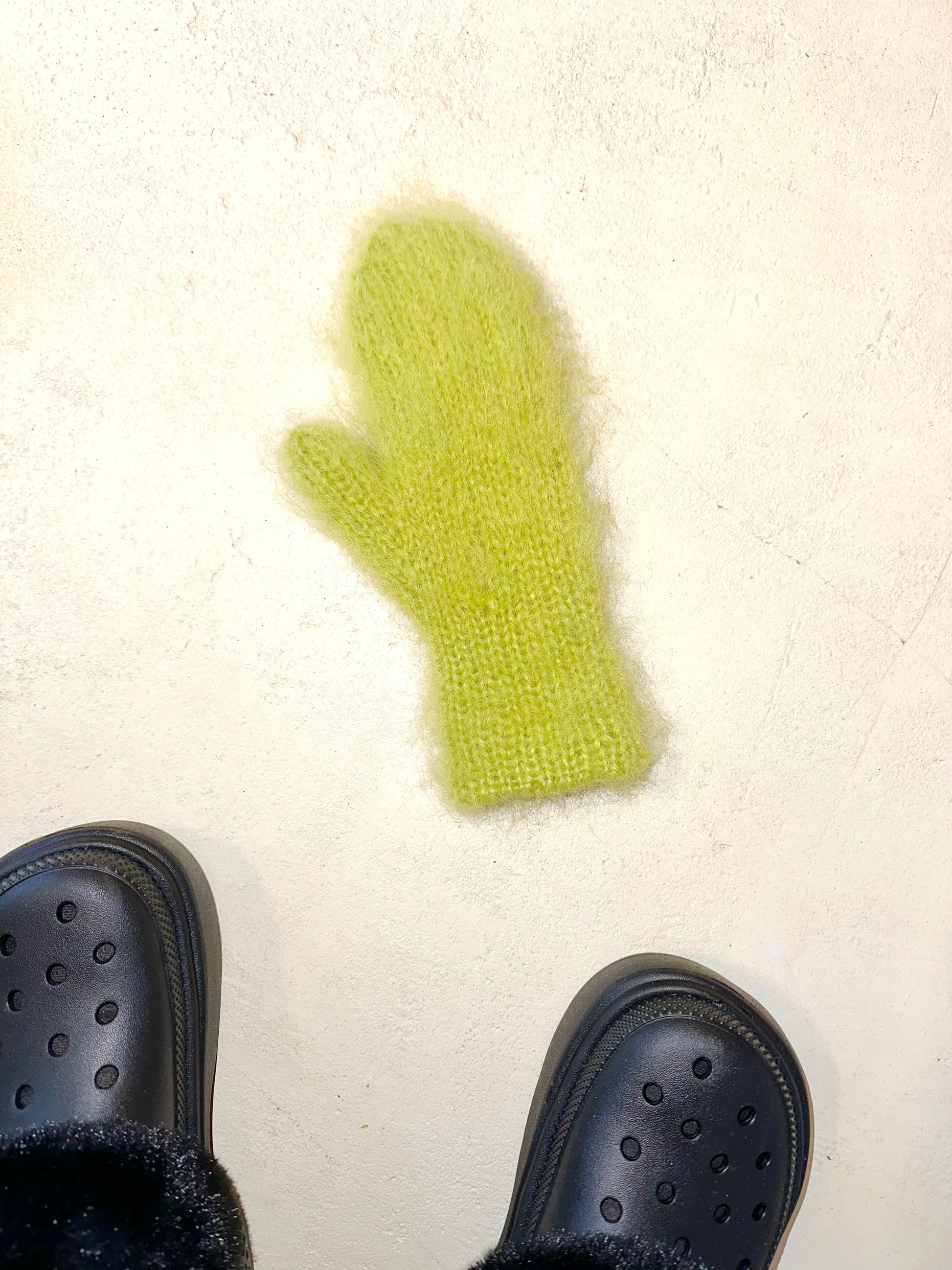 Fat Fur Mittens is a pair of thick, lined mittens. The mittens are knit in a long haired mohair yarn, which is brushed at the end using a mohair brush, which makes the fibers long, soft and furry.