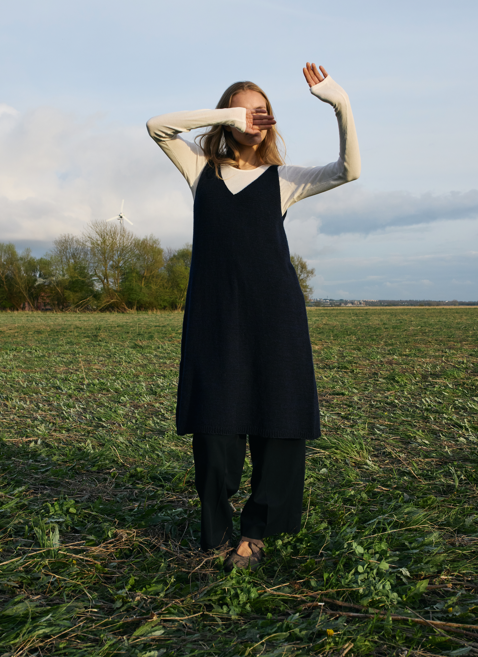 Inge Dress is worked top-down. The dress has a deep V-neck both front and back, and the skirt is slightly A-shaped