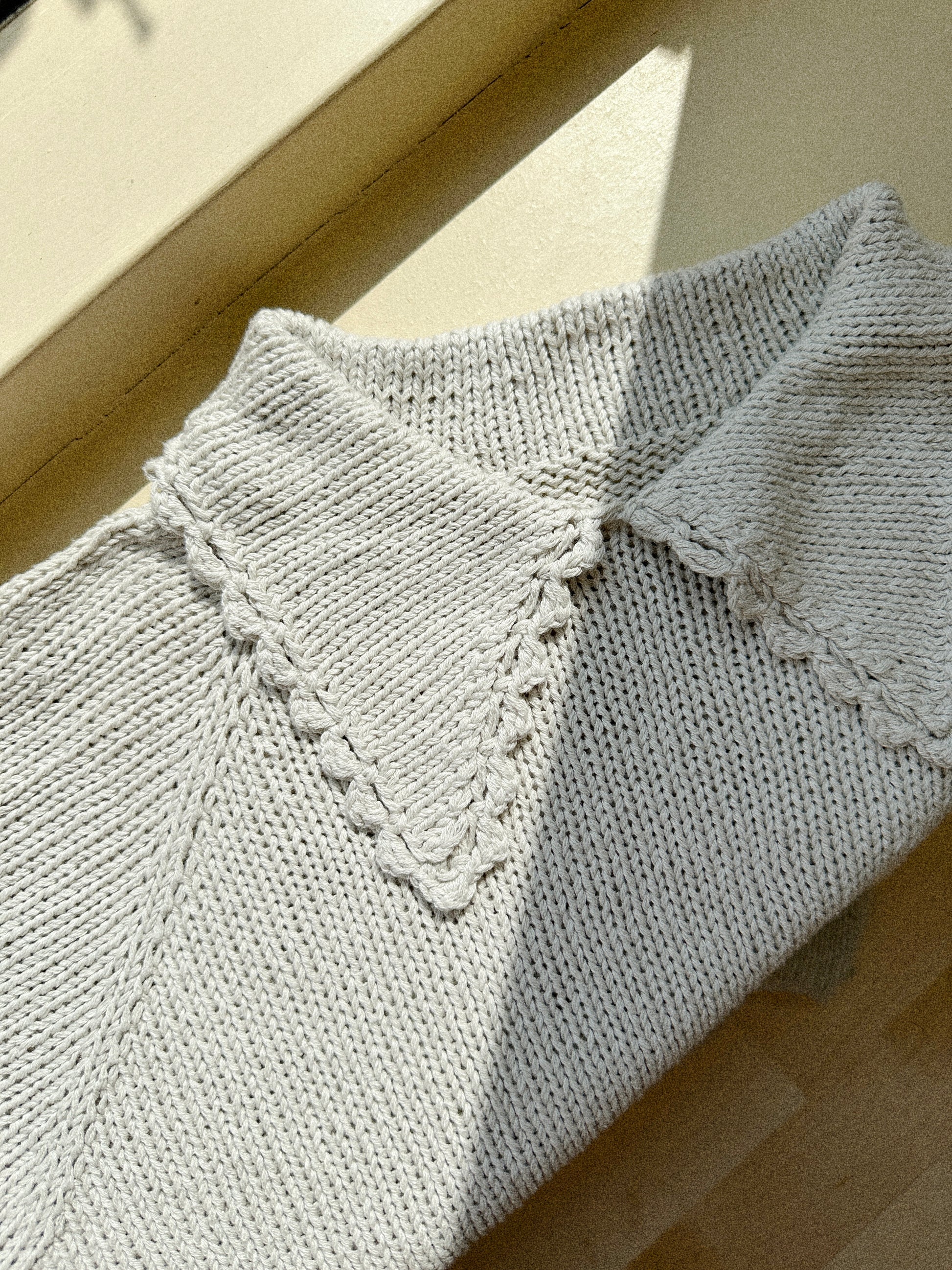 Once the neck and shoulders are shaped, divide the work into body and sleeves. Put the stitches for the sleeves aside and finish the body in stocking stitch and bind off from the wrong side. Then work the sleeves in the round in stocking stitch and finish in the same way. Finally, crochet a picot edge along the collar.