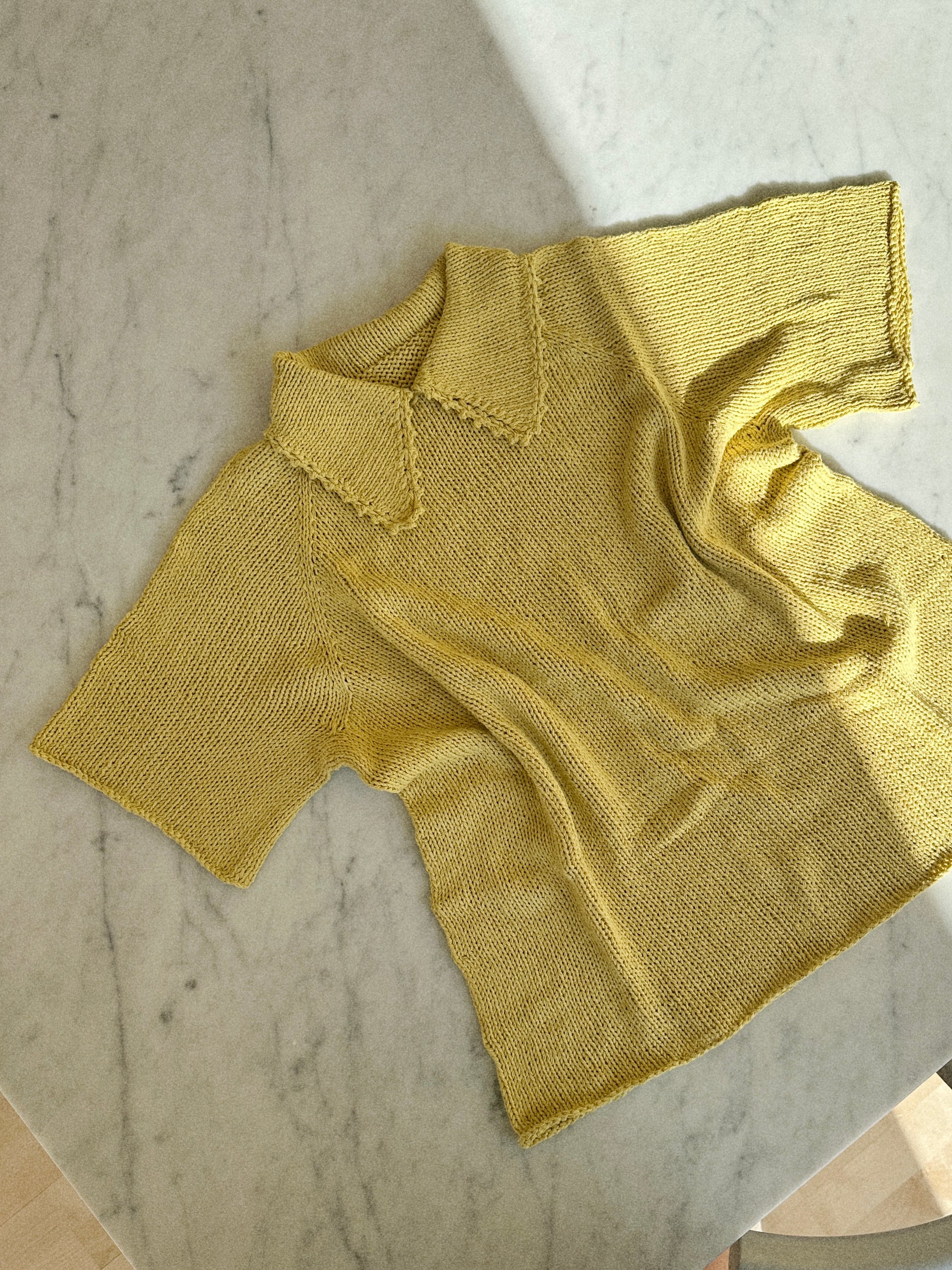The Lace Polo Tee is knitted top down with raglan increases and short rows to shape the neckline. The tee begins with the collar, which is knitted back and forth in stockinette stitch with decreases. Then continue in the round in stockinette stitch with raglan increases and short rows (German Short Rows).