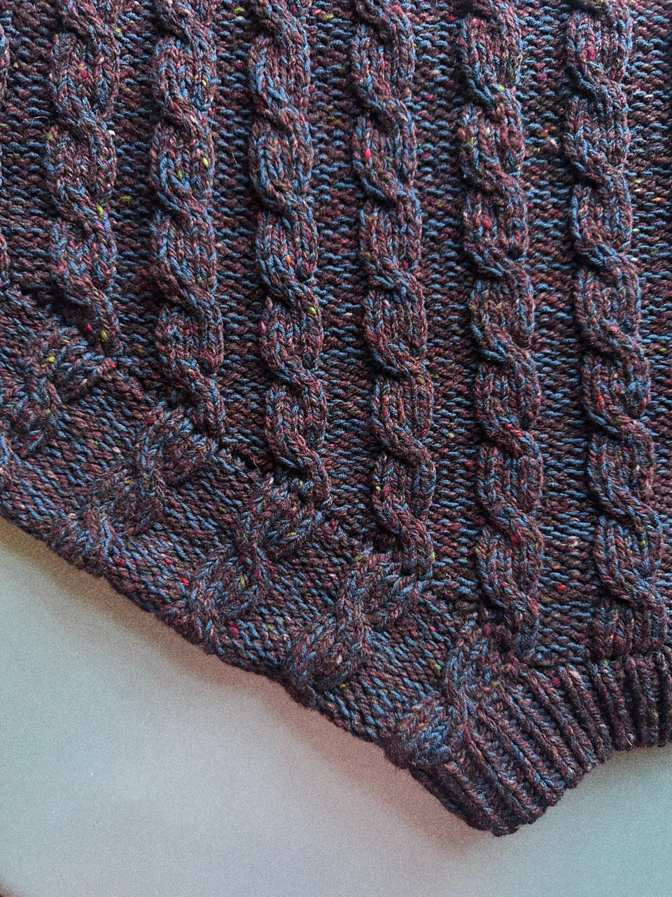 The cardigan is knit top down in a cable pattern. First, the back and fronts are worked flat to the bottom of the armhole, then the pieces are joined and the body is continued flat. The sleeves are knit down from stitches picked up along the armhole and shaped with decreases. Finally, the neckband is worked and the cardigan is finished with buttons.