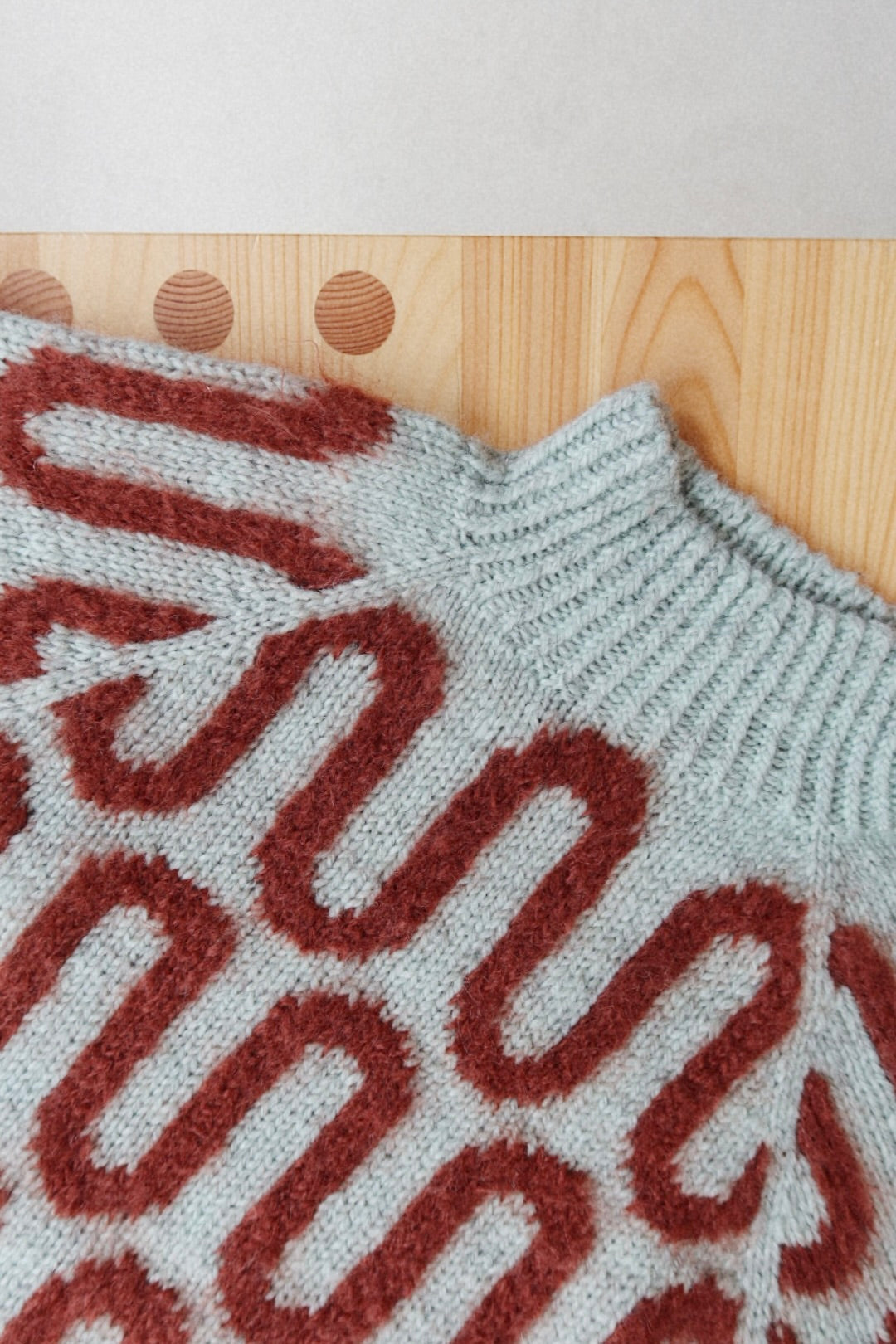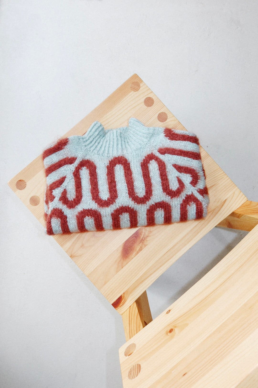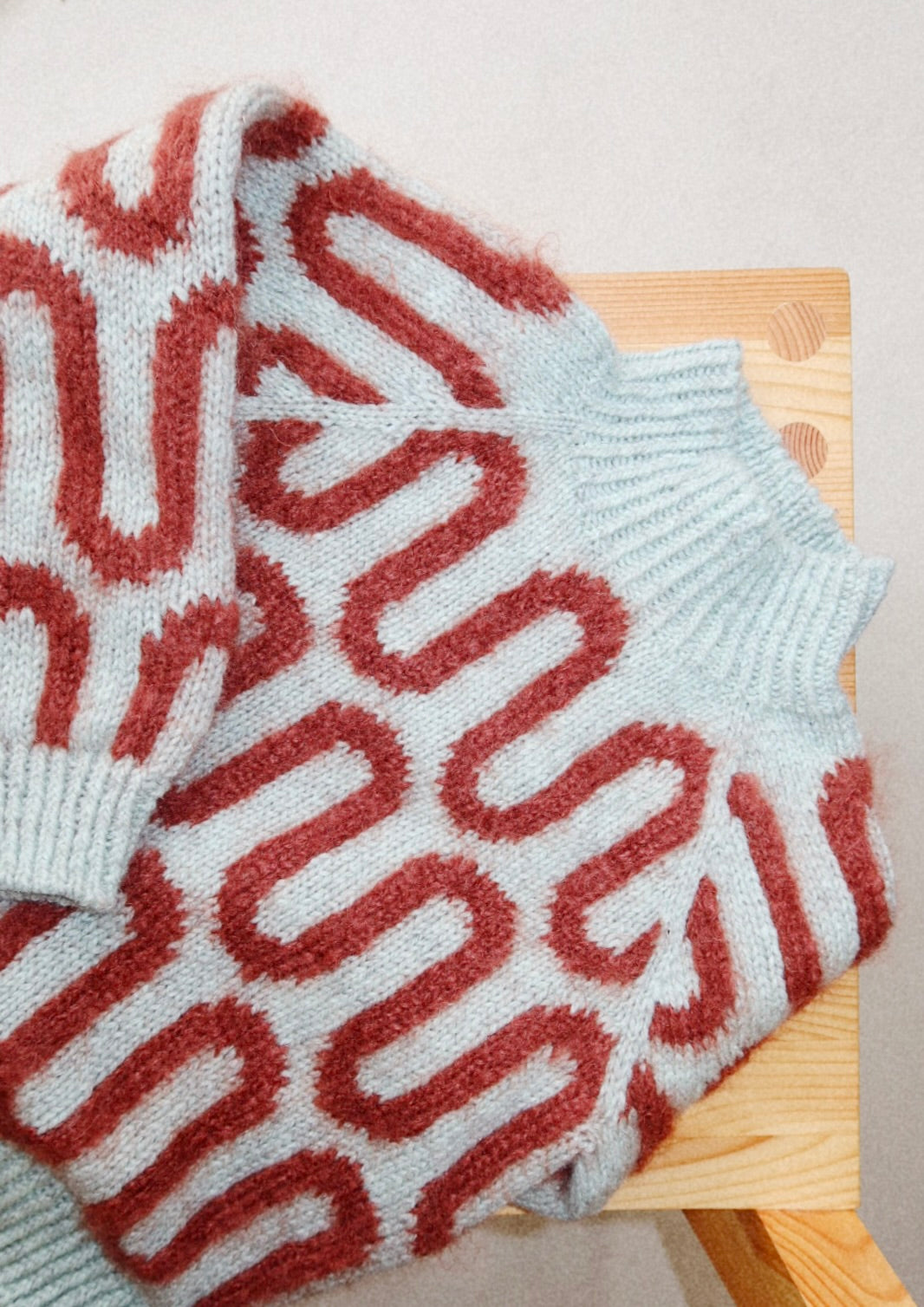 Wave Sweater features a striking stranded pattern and a turtle neck in twisted rib. The sweater is worked from the top down.
